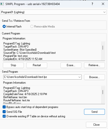 SIMPL Programタブが出てきたら、下のチェックボックスにすべてチェックをいれSendを押します。