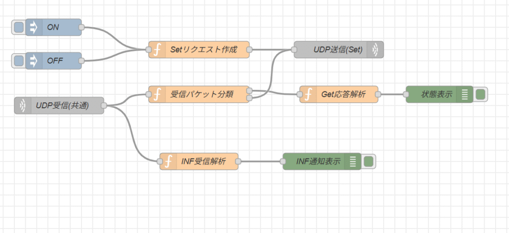 UDP送信するとレスポンスが返ってきますが、念の為にUDP INノードの後にdelayノードをいれ200msの遅延をいれました。