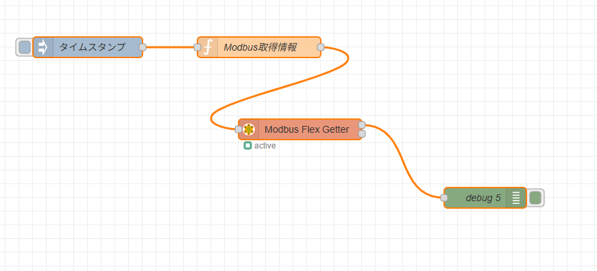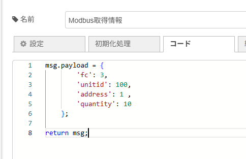 [{"id":"d9fe244914115dd4","type":"modbus-flex-getter","z":"2e3bfa49201b1a94","name":"","showStatusActivities":false,"showErrors":false,"showWarnings":true,"logIOActivities":false,"server":"ea6a6fe883e135ac","useIOFile":false,"ioFile":"","useIOForPayload":false,"emptyMsgOnFail":false,"keepMsgProperties":false,"delayOnStart":false,"enableDeformedMessages":false,"startDelayTime":"","x":570,"y":360,"wires":[["3d0d3fe722b68443"],[]]},{"id":"cb9b8b903530e531","type":"function","z":"2e3bfa49201b1a94","name":"Modbus取得情報","func":"msg.payload = { \n 'fc': 3,\n 'unitid': 100,\n 'address': 1 ,\n 'quantity': 10\n };\n\nreturn msg;","outputs":1,"timeout":0,"noerr":0,"initialize":"","finalize":"","libs":[],"x":510,"y":240,"wires":[["d9fe244914115dd4"]]},{"id":"3d0d3fe722b68443","type":"debug","z":"2e3bfa49201b1a94","name":"debug 5","active":true,"tosidebar":true,"console":false,"tostatus":false,"complete":"false","statusVal":"","statusType":"auto","x":840,"y":460,"wires":[]},{"id":"65d656521acf51ac","type":"inject","z":"2e3bfa49201b1a94","name":"","props":[{"p":"payload"},{"p":"topic","vt":"str"}],"repeat":"","crontab":"","once":false,"onceDelay":0.1,"topic":"","payload":"","payloadType":"date","x":260,"y":240,"wires":[["cb9b8b903530e531"]]},{"id":"ea6a6fe883e135ac","type":"modbus-client","name":"","clienttype":"tcp","bufferCommands":true,"stateLogEnabled":false,"queueLogEnabled":false,"failureLogEnabled":true,"tcpHost":"192.168.1.103","tcpPort":502,"tcpType":"DEFAULT","serialPort":"/dev/ttyUSB","serialType":"RTU-BUFFERD","serialBaudrate":9600,"serialDatabits":8,"serialStopbits":1,"serialParity":"none","serialConnectionDelay":100,"serialAsciiResponseStartDelimiter":"0x3A","unit_id":1,"commandDelay":1,"clientTimeout":1000,"reconnectOnTimeout":true,"reconnectTimeout":2000,"parallelUnitIdsAllowed":true,"showErrors":false,"showWarnings":true,"showLogs":true},{"id":"779cf83f1c86d698","type":"global-config","env":[],"modules":{"node-red-contrib-modbus":"5.45.1"}}]