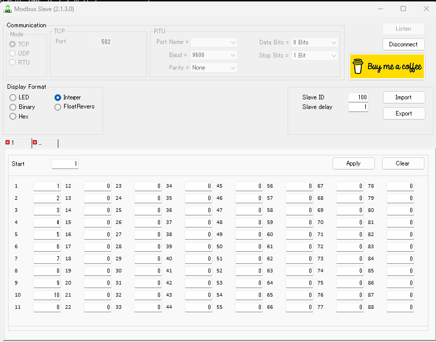 こうすることで、ModbusSlaveのアドレス1から10までの値を配列で取得します。