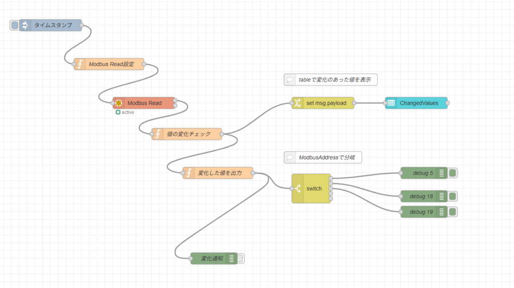 [{"id":"86c8834a380f5716","type":"function","z":"2e3bfa49201b1a94","name":"Modbus Read設定","func":"msg.payload = { \n 'fc': 4, // Holding Register を読み取る(必要に応じて4に変更可能)\n 'unitid': 100,\n 'address': 1,\n 'quantity': 10\n };\nreturn msg;","outputs":1,"timeout":0,"noerr":0,"initialize":"","finalize":"","libs":[],"x":510,"y":360,"wires":[["eb22b5ccdf75ba64"]]},{"id":"eb22b5ccdf75ba64","type":"modbus-flex-getter","z":"2e3bfa49201b1a94","name":"Modbus Read","showStatusActivities":false,"showErrors":false,"showWarnings":true,"logIOActivities":false,"server":"ea6a6fe883e135ac","useIOFile":false,"ioFile":"","useIOForPayload":false,"emptyMsgOnFail":false,"keepMsgProperties":false,"delayOnStart":false,"enableDeformedMessages":false,"startDelayTime":"","x":600,"y":460,"wires":[["1c0901749f6388aa"],[]]},{"id":"1c0901749f6388aa","type":"function","z":"2e3bfa49201b1a94","name":"値の変化チェック","func":"// Modbus データ(配列)\nlet current = msg.payload;\n\n// 配列チェック\nif (!Array.isArray(current)) {\n node.error(\"Modbusデータが配列ではありません: \" + JSON.stringify(current));\n return null;\n}\n\n// 前回値を取得\nlet before = flow.get('before_value');\n\n// -------------------------\n// 初回:全ての値を changes として出力\n// -------------------------\nif (!before) {\n let changes = [];\n\n for (let i = 0; i < current.length; i++) {\n changes.push({\n index: i,\n old: null, // 初回は old が存在しないので null\n new: current[i],\n address: i + 1\n });\n }\n\n // 初回の before を保存(deep copy)\n flow.set('before_value', JSON.parse(JSON.stringify(current)));\n\n msg.payload = {\n message: \"初回データを読み込みました\",\n changes: changes,\n timestamp: new Date().toISOString()\n };\n return msg;\n}\n\n// -------------------------\n// 2回目以降:変化チェック\n// -------------------------\nlet changes = [];\n\nfor (let i = 0; i < current.length; i++) {\n if (current[i] !== before[i]) {\n changes.push({\n index: i,\n old: before[i],\n new: current[i],\n address: i + 1\n });\n }\n}\n\n// 変化なし → 出力しない\nif (changes.length === 0) {\n return null;\n}\n\n// before を更新(deep copy)\nflow.set('before_value', JSON.parse(JSON.stringify(current)));\n\n// 出力\nmsg.payload = {\n message: \"Modbus値が変化しました\",\n changes: changes,\n timestamp: new Date().toISOString()\n};\n\nreturn msg;\n","outputs":1,"timeout":0,"noerr":0,"initialize":"","finalize":"","libs":[],"x":710,"y":540,"wires":[["a77fda590a76fba4","7e4ac6863a6ed4f3"]]},{"id":"53cc11ac5a41b09d","type":"debug","z":"2e3bfa49201b1a94","name":"変化通知","active":false,"tosidebar":true,"console":false,"tostatus":false,"complete":"payload","targetType":"msg","statusVal":"","statusType":"auto","x":780,"y":860,"wires":[]},{"id":"30ae643c57ae22d9","type":"ui-table","z":"2e3bfa49201b1a94","group":"5d9040f02211696f","name":"ChangedValues","label":"text","order":1,"width":0,"height":0,"maxrows":0,"passthru":false,"autocols":true,"showSearch":true,"deselect":true,"selectionType":"none","columns":[],"mobileBreakpoint":"sm","mobileBreakpointType":"defaults","action":"replace","x":1300,"y":460,"wires":[[]]},{"id":"3873d7b6cc170533","type":"inject","z":"2e3bfa49201b1a94","name":"","props":[{"p":"payload"},{"p":"topic","vt":"str"}],"repeat":"","crontab":"","once":false,"onceDelay":0.1,"topic":"","payload":"","payloadType":"date","x":360,"y":260,"wires":[["86c8834a380f5716"]]},{"id":"a77fda590a76fba4","type":"function","z":"2e3bfa49201b1a94","name":"変化した値を出力","func":"// 受信した payload\nlet changes = msg.payload.changes;\n\n// 配列チェック\nif (!Array.isArray(changes)) {\n node.error(\"changes が配列ではありません\");\n return null;\n}\n\n// 出力メッセージの配列を作成\nlet msgs = [];\n\nchanges.forEach(change => {\n msgs.push({\n payload: change\n });\n});\n\n// changes の要素数分、別々のメッセージとして出力\nreturn [msgs];\n","outputs":1,"timeout":0,"noerr":0,"initialize":"","finalize":"","libs":[],"x":790,"y":640,"wires":[["53cc11ac5a41b09d","0a2c3d8c9df8f52e"]]},{"id":"7e4ac6863a6ed4f3","type":"change","z":"2e3bfa49201b1a94","name":"","rules":[{"t":"set","p":"payload","pt":"msg","to":"payload.changes","tot":"msg"}],"action":"","property":"","from":"","to":"","reg":false,"x":1060,"y":460,"wires":[["30ae643c57ae22d9"]]},{"id":"0a2c3d8c9df8f52e","type":"switch","z":"2e3bfa49201b1a94","name":"","property":"payload.address","propertyType":"msg","rules":[{"t":"eq","v":"1","vt":"num"},{"t":"eq","v":"2","vt":"num"},{"t":"eq","v":"3","vt":"num"},{"t":"eq","v":"4","vt":"num"},{"t":"eq","v":"5","vt":"num"}],"checkall":"true","repair":false,"outputs":5,"x":1030,"y":680,"wires":[["a7addda30e2296f9"],["9b74b6526ed6d0ab"],["393b6d4ab6ca166d"],[],[]]},{"id":"a7addda30e2296f9","type":"debug","z":"2e3bfa49201b1a94","name":"debug 5","active":true,"tosidebar":true,"console":false,"tostatus":false,"complete":"false","statusVal":"","statusType":"auto","x":1320,"y":640,"wires":[]},{"id":"9b74b6526ed6d0ab","type":"debug","z":"2e3bfa49201b1a94","name":"debug 18","active":true,"tosidebar":true,"console":false,"tostatus":false,"complete":"false","statusVal":"","statusType":"auto","x":1320,"y":700,"wires":[]},{"id":"393b6d4ab6ca166d","type":"debug","z":"2e3bfa49201b1a94","name":"debug 19","active":true,"tosidebar":true,"console":false,"tostatus":false,"complete":"false","statusVal":"","statusType":"auto","x":1320,"y":740,"wires":[]},{"id":"f601297aabce0473","type":"comment","z":"2e3bfa49201b1a94","name":"tableで変化のあった値を表示","info":"","x":1080,"y":400,"wires":[]},{"id":"6a67b90fdfa21dda","type":"comment","z":"2e3bfa49201b1a94","name":"ModbusAddressで分岐","info":"","x":1060,"y":600,"wires":[]},{"id":"ea6a6fe883e135ac","type":"modbus-client","name":"","clienttype":"tcp","bufferCommands":true,"stateLogEnabled":false,"queueLogEnabled":false,"failureLo
