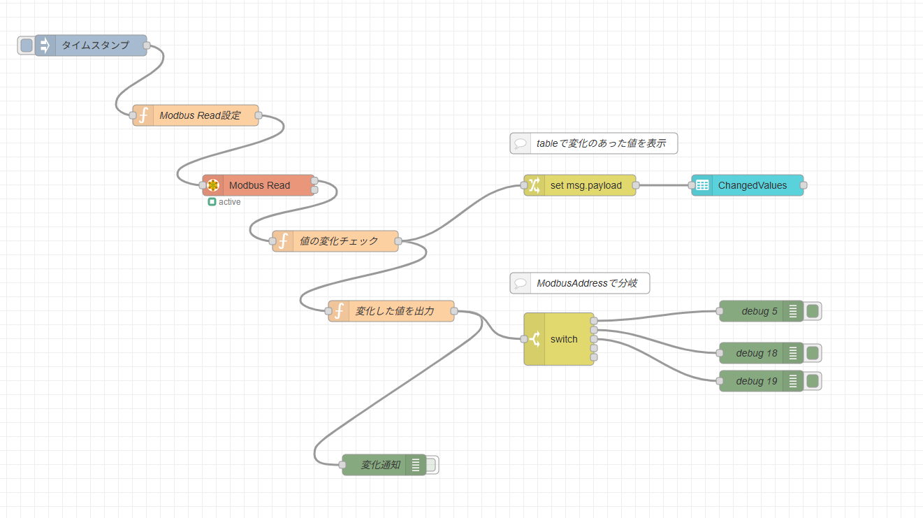 ModbusSlaveのInput(FC4)の値を1秒ごとに10アドレスづつ読み込み、変化があったもののみを出力するフロー
