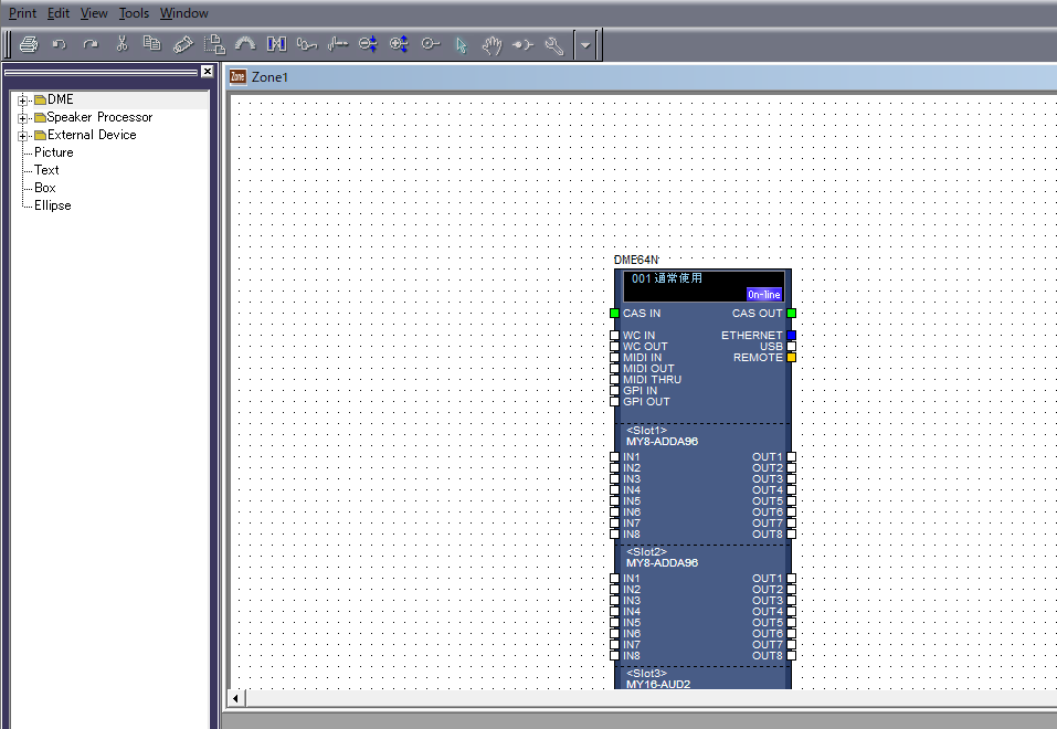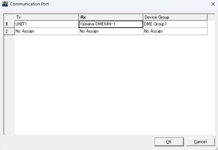 接続としては、on-lineをクリックすると下記の画面が出ます。ここがNo Assignになっているため、Wi-Fiの場合は自分で設定した名前(今回はUNIT1)、USBの場合はYamaha DME64Nを選択してください。