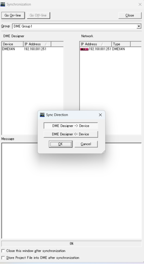 初めは、左のIPアドレスが空欄のこともあるので、その場合は初めに設定したIPアドレスと同じものを選択してもう一度Go on-lineを押してください。