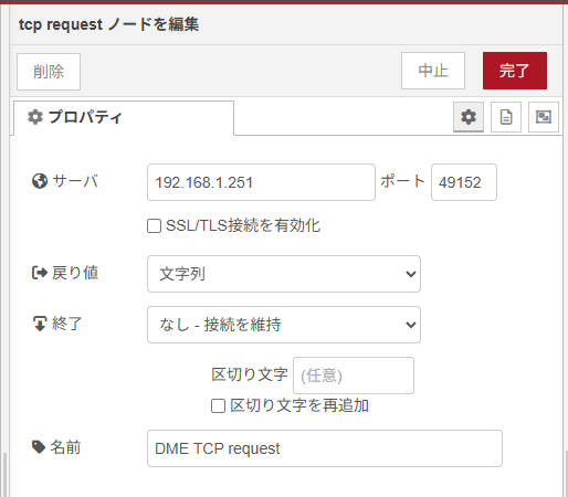 Node-REDとはTCPで接続していきます。ここで初めに確認したポートを使います。