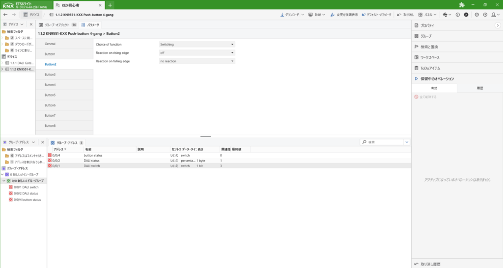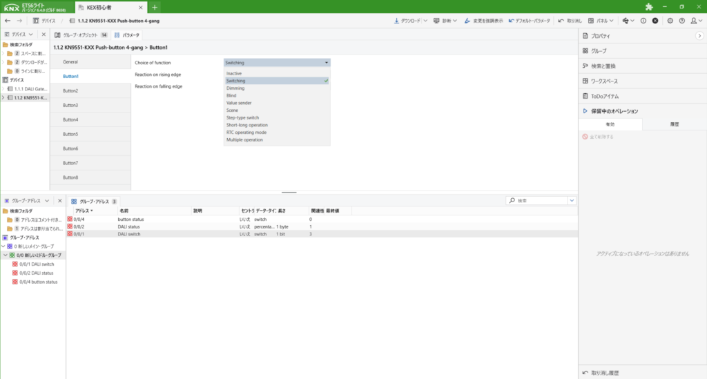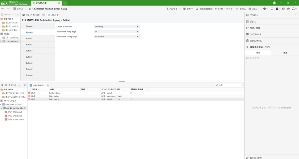 ここで、DALIアクティベートの際にgroup1に登録したので、DALI switchとbutton statusを[1]groupのswitchにドラック&ドロップします。