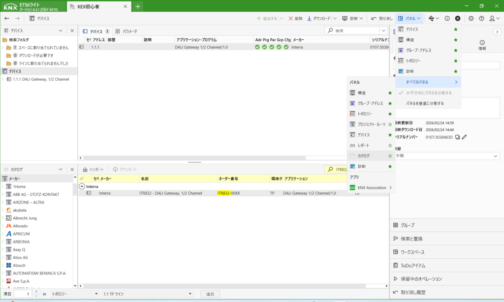 プロジェクトを開いたら、使用するデバイスを登録します。右上のパネルからすべてのパネル→カタログをクリックします。