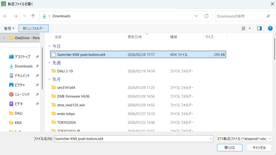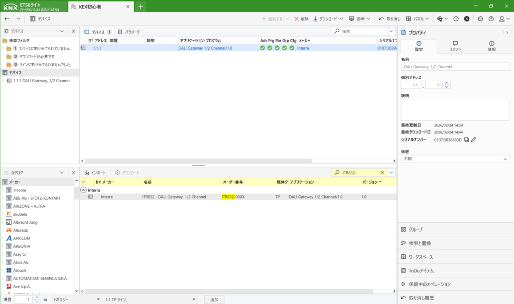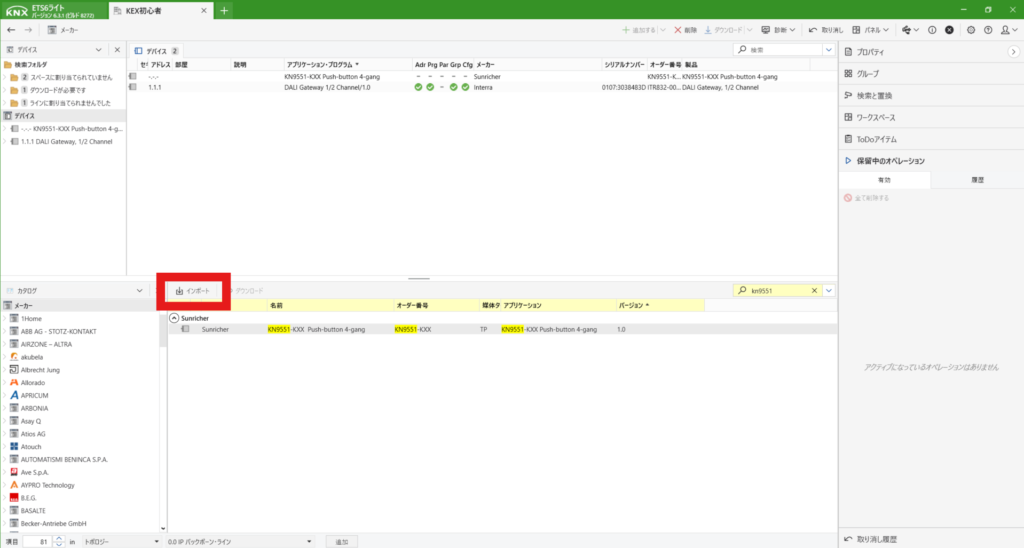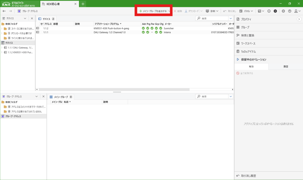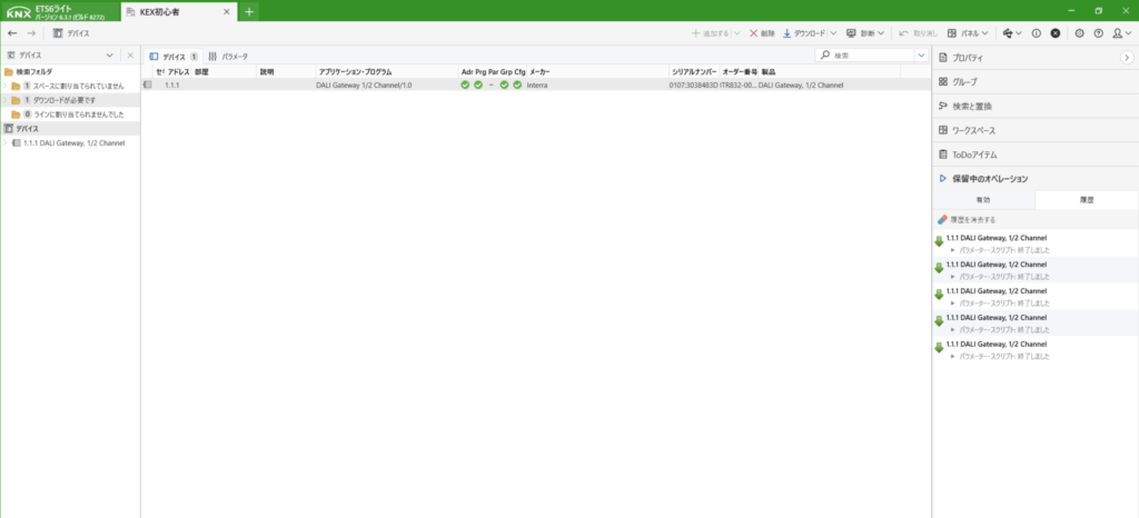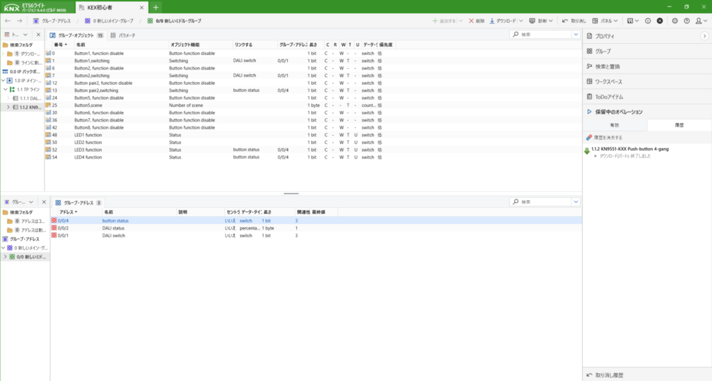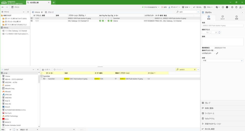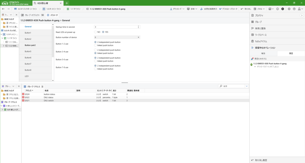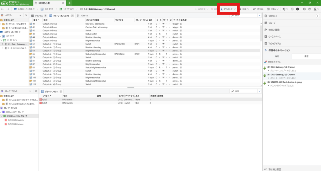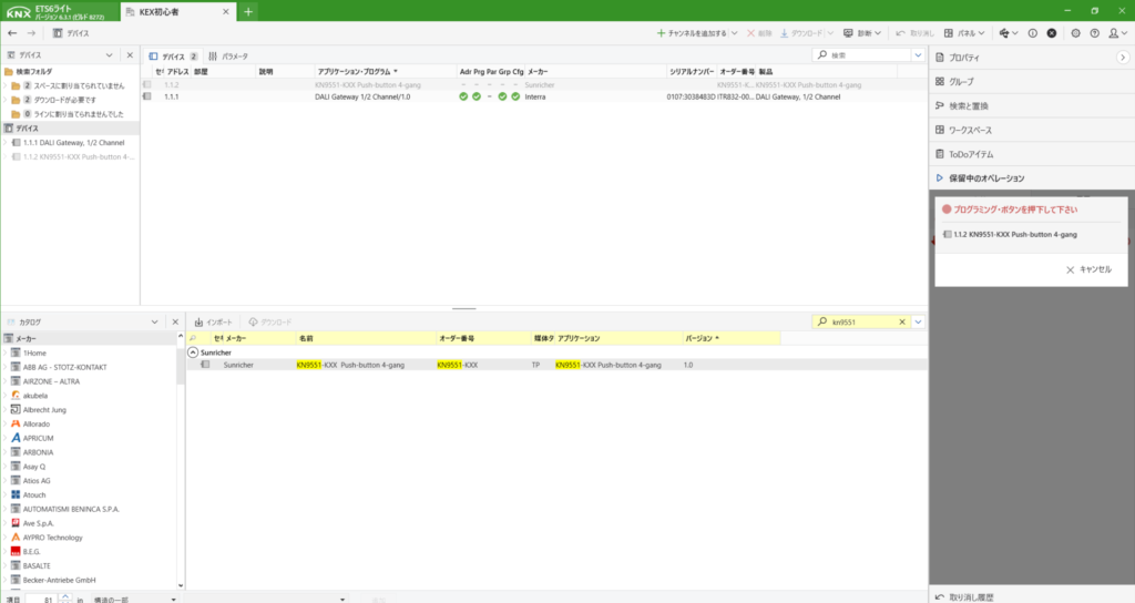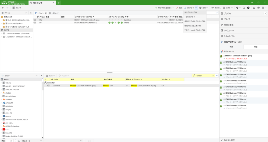 KNXは初めて登録する際は、プログラムボタンを押さないといけません。上にあるダウンロードからすべてをダウンロードを選択します。すると右側に「プログラムボタンを押してください」と出てきますので、デバイス本体のボタンを押します。