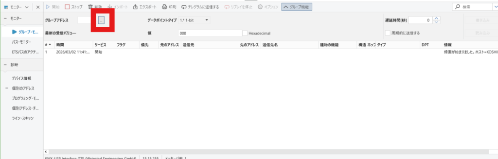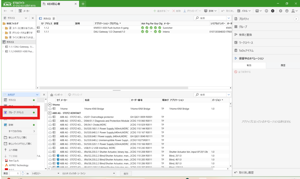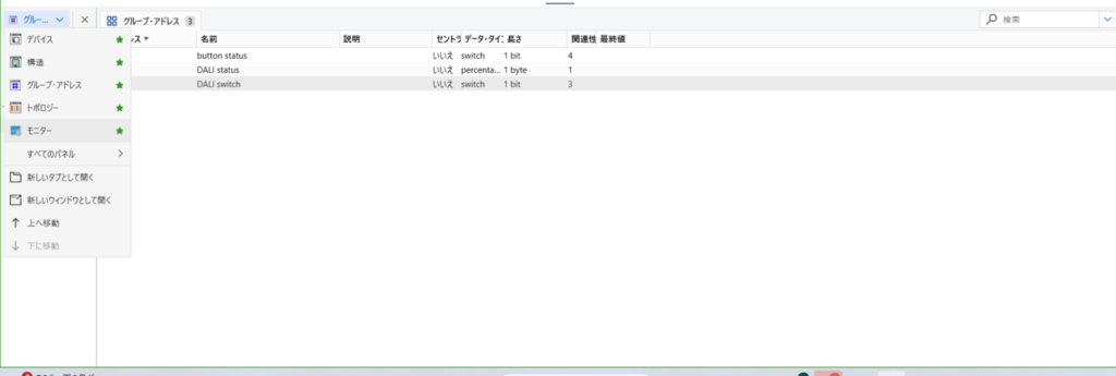 ETSではアドレスページでグループアドレスを作り、機器にアドレスを振り分け動作させます。パネルになければすべてのパネルから選択してください。