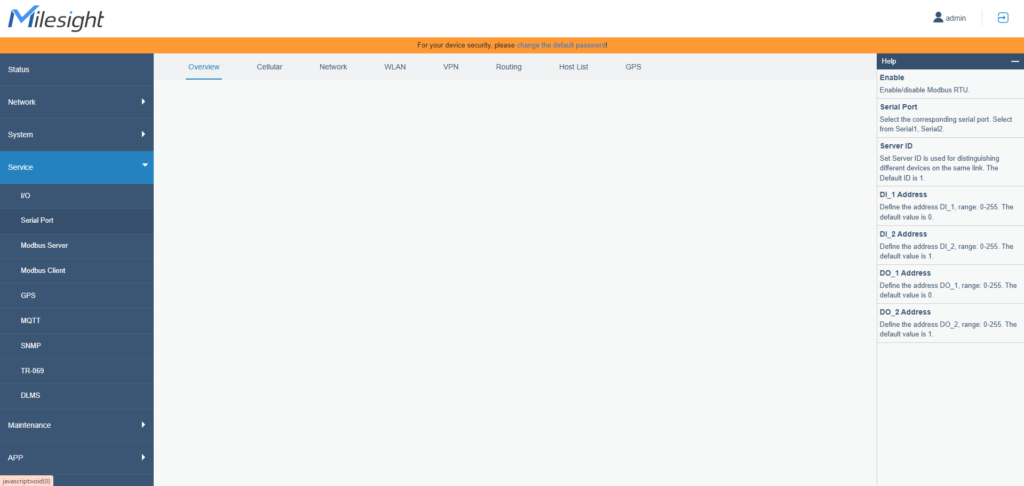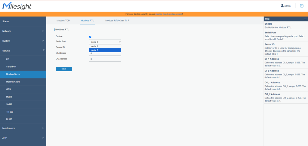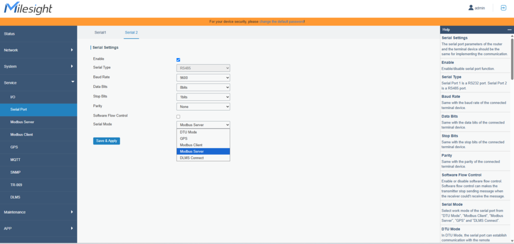 今回はPC上で確認するため、Serial ModeをModbus Serverにしてください。