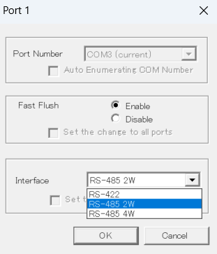 Ports ConfigutationでPort Settingを開きRS-485 2Wに変更してください。