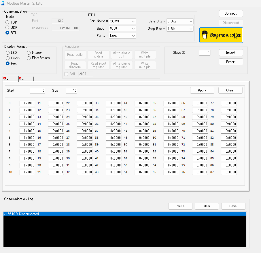 ここまで設定できたらModbus通信ができているか確認します。