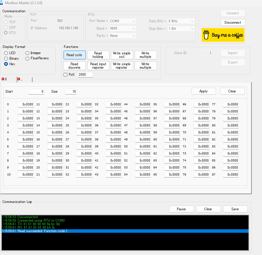 左上のConnectで接続し、Read coilsをクリックしてください。