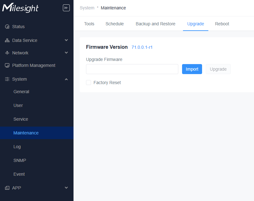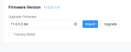 EG71のMaintenanceページから先ほどダウンロードしたFWファイルをImport>Upgradeします。
