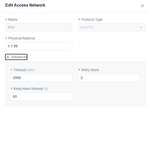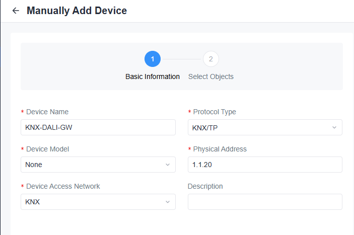 今回はKNX-DALI GWを使います。一般的にKNXと連携するときには個別アドレスは使わず、GroupAddressだけが多いのですが、KNX-DALI-GWの個別アドレス1.1.20を入力します。