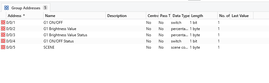 KNX-DALI Gatewayで照明G1のBrightness Value StatusのGroupAddressを入力しました。