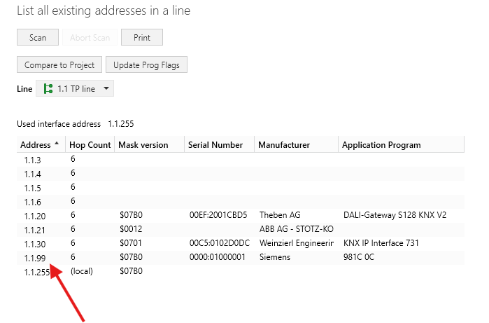 おそらく、これがEG71のKNXの個別アドレスだと予測されますが、これを設定した後に、ETSのDiagnosticsからLine Scanをすると、